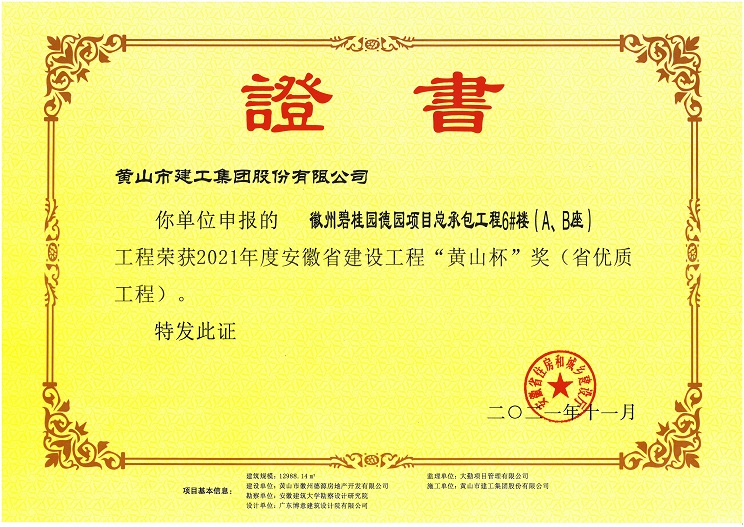 由黄山建工集团承建的徽州区碧桂园德园项目总承包工程6#楼(A、B座) 工程荣获安徽省工程质量最高奖“黄山杯”奖。该工程在开工伊始,项目部就制订了创优目标,严格过程控制,建立健全项目质量管理体系,狠抓现场施工管理,把好施工过程质量控制关,为创精品工程打下坚实的基础。