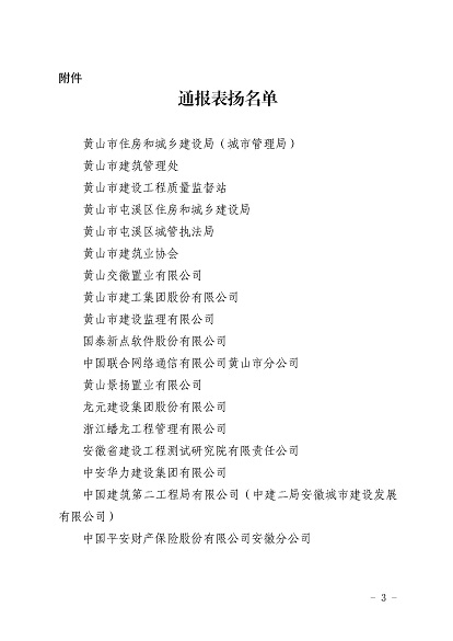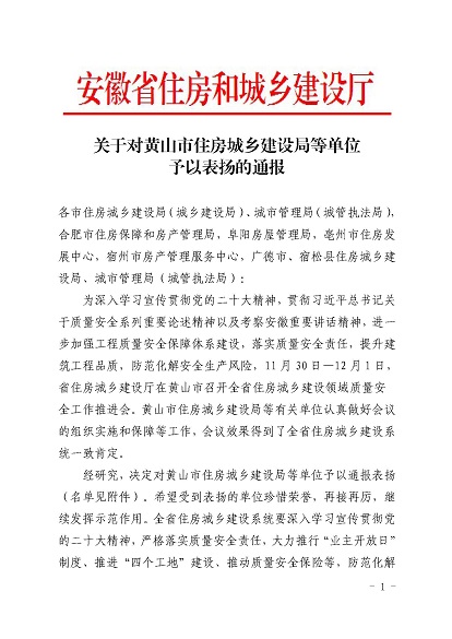 近日,安徽省住房和城乡建设厅印发《关于对黄山市住房和城乡建设局等单位予以表扬的通报》,《通报》指出,11月30日-12月1日,省住房和城乡建设厅在黄山市召开全省住房建设领域质量安全工作推进会,会议效果得到全省住房城乡建设系统一致肯定,并对在此次会议认真做好组织实施和保障的单位予以通报表扬,KY平台-KY(中国)一站式服务平台 作为唯一一家本土建筑施工企业荣获表扬。