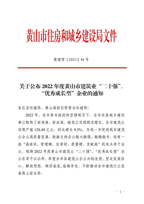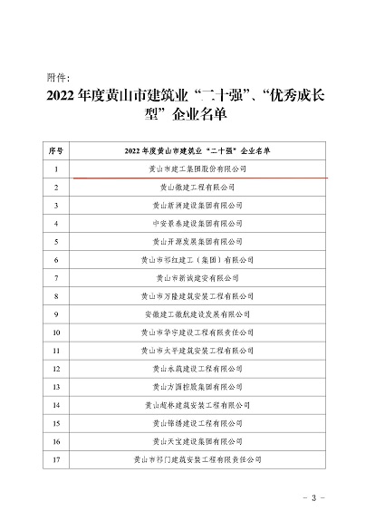 黄山建工将以此次获得2022年度“黄山市建筑业二十强企业”荣誉称号为契机,踔力奋发,笃行不怠,持续强化责任意识、服务意识和创新意识,发挥黄山市建筑行业先锋模范带头作用,积极推动公司的高质量发展,为开创黄山建筑行业新时代,新征程,新伟业创造更加灿烂的明天!