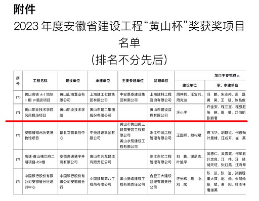7月25日,省住建厅公布2023年度安徽省建设工程“黄山杯”奖获奖项目名单,黄山建工承建的黄山职业技术学院风雨操场项目工程位列榜单、喜获殊荣。