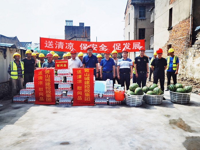 烈日炎炎,气温居高不下。为保障项目职工安全健康权益,确保项目安全生产平稳推进,8月10日上午,黄山城投城建控股有限公司总经理汪国文等一行赴宁国市河沥文化街区EPC项目工地开展走访调研暨“夏送清凉”慰问活动。黄山建工集团股份有限公司董事长项端阳、总经理叶金发、副总经理吴学武陪同调研慰问。