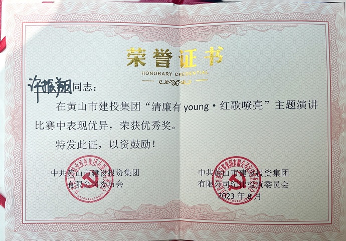 为庆祝中国共产党成立102周年,深入推动学习贯彻习近平新时代中国特色社会主义思想主题教育,全面贯彻落实党的二十大精神,8月18日,由黄山建投集团举办的“清廉有young·红歌嘹亮”主题思政课隆重举行,参赛选手以生动的语言、动听的歌声、真挚的感情为大家带来一场别开生面的视听盛宴,黄山建工集团青年员工许振翔在思政课演讲比赛中取得优胜奖。