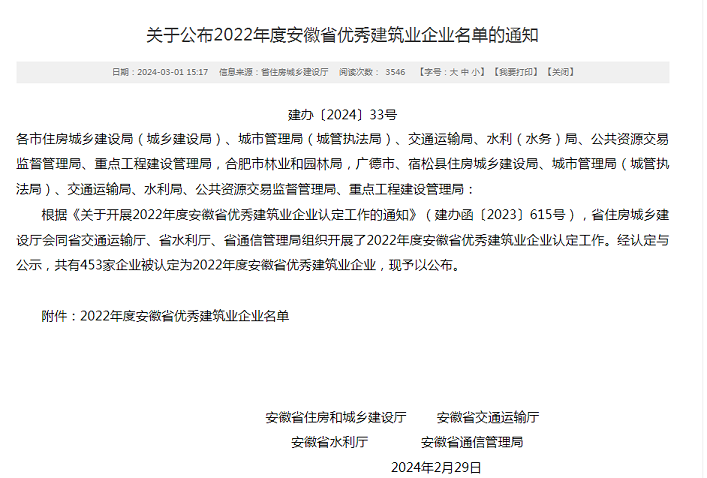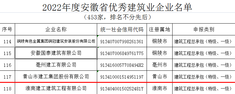 近日,安徽省住房和城乡建设厅发布了“2022年度安徽省优秀建筑业企业”名单,黄山建工集团凭借企业经营发展、管理创新能力、企业建造能力、KY平台建设、社会责任履行等方面的卓越表现再次名列榜单――建筑工程总承包类(特级、一级类别)省优秀建筑业企业,连续多年斩获该项殊荣。