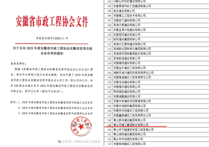 此次获评省优秀市政施工企业,是行业权威部门对黄山建工集团在市政工程建设领域综合实力、管理水平及品牌影响力的高度认可,标志着集团在市政基础设施建设领域的核心竞争力迈上新台阶。这既是对过去的肯定,也是对未来的期许。集团将以此为动力,秉承 “质量第一,信誉至上” 的企业宗旨,持续深化内部管理,提升工程质量与服务水平。充分发挥优秀市政企业和优秀建造师的示范引领作用,以更饱满的热情、更务实的作风,打造更多政府放心、市民满意的精品市政工程,为推动安徽省及黄山市城市建设高质量发展贡献力量。