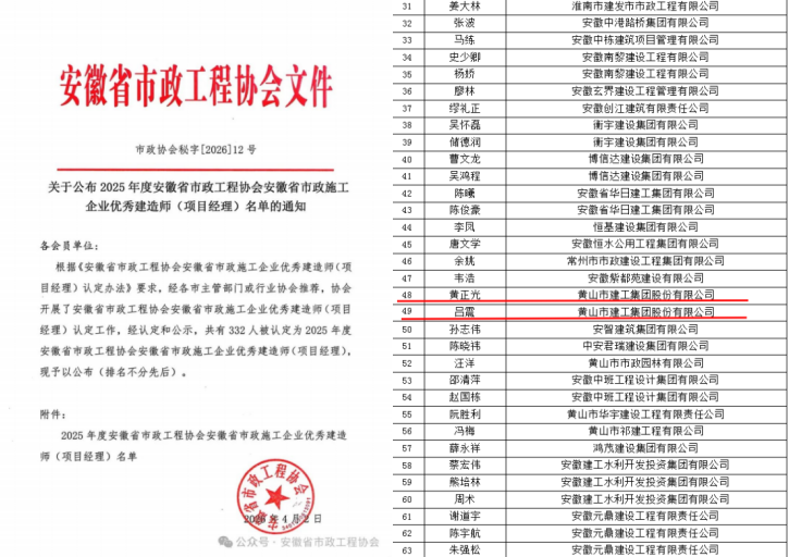 近日,安徽省市政工程协会发布了《关于公布2025年度安徽省市政工程协会安徽省优秀市政施工企业名单的通知》及《关于公布2025年度安徽省市政工程协会安徽省市政施工企业优秀建造师(项目经理)名单的通知》。KY平台-KY(中国)一站式服务平台 凭借卓越的综合实力与优质的工程业绩,连续多年荣登“2025年度安徽省优秀市政施工企业”榜单。这也是继集团获“2024年度安徽省优秀建筑业企业”后,在工程建设领域收获的又一重量级荣誉。 同时,黄正光、吕震两位同志凭借扎实的专业素养和出色的项目管理能力,双双荣获“安徽省市政施工企业优秀项目经理”称号。